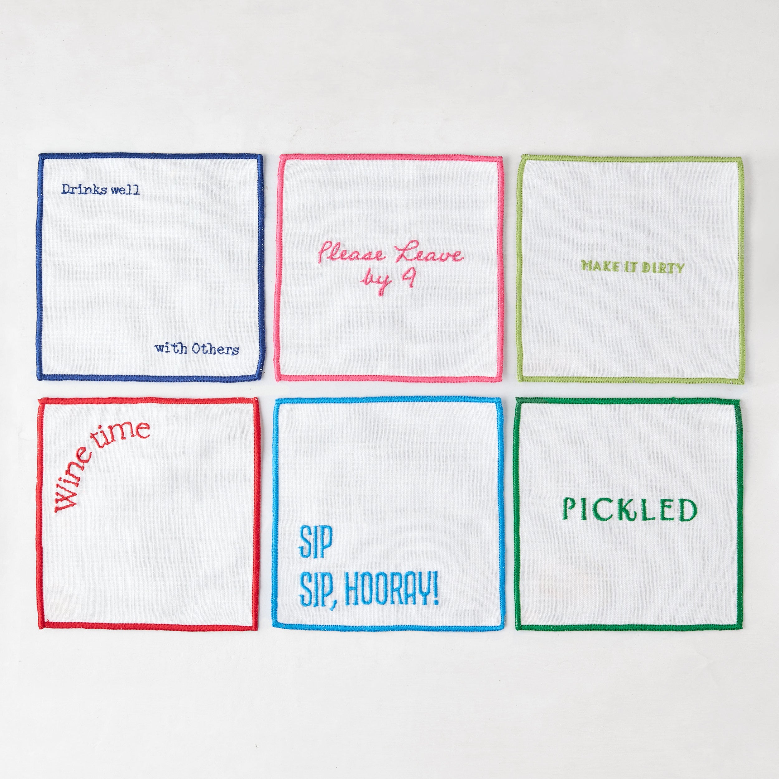 The Embroidered Conversation Coasters are a colorful and fun way to protect your table. With 6 different sayings in 6 different colors these coasters can work for any event and are the perfect addition to your bar cart.