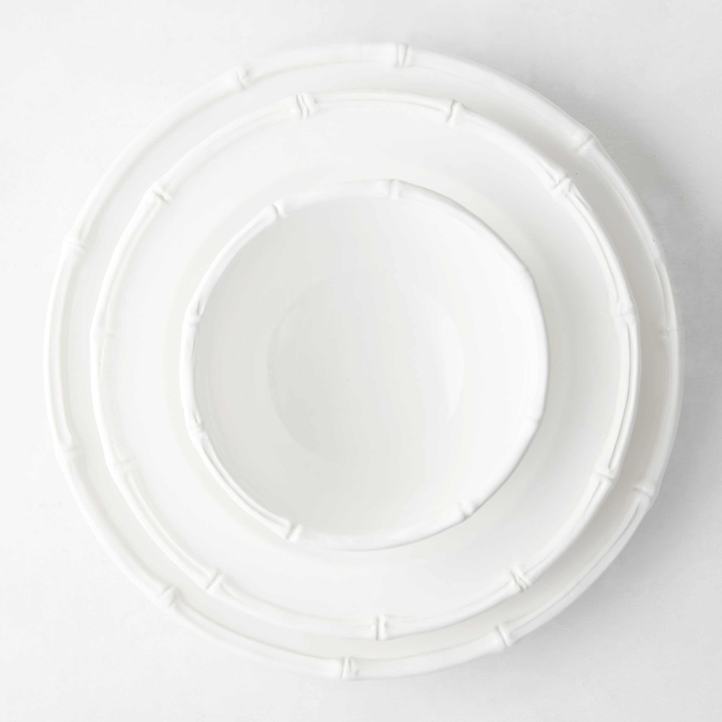 Our Bamboo Dinner Plate is a different take on the classic white dinnerware we love so much. With a simple molded edge replicating bamboo, this plate is fun, chic, and makes entertaining that much more exciting. It can be layered easily with other HG whiteware pieces, or collect the entire collection and make every meal fun.